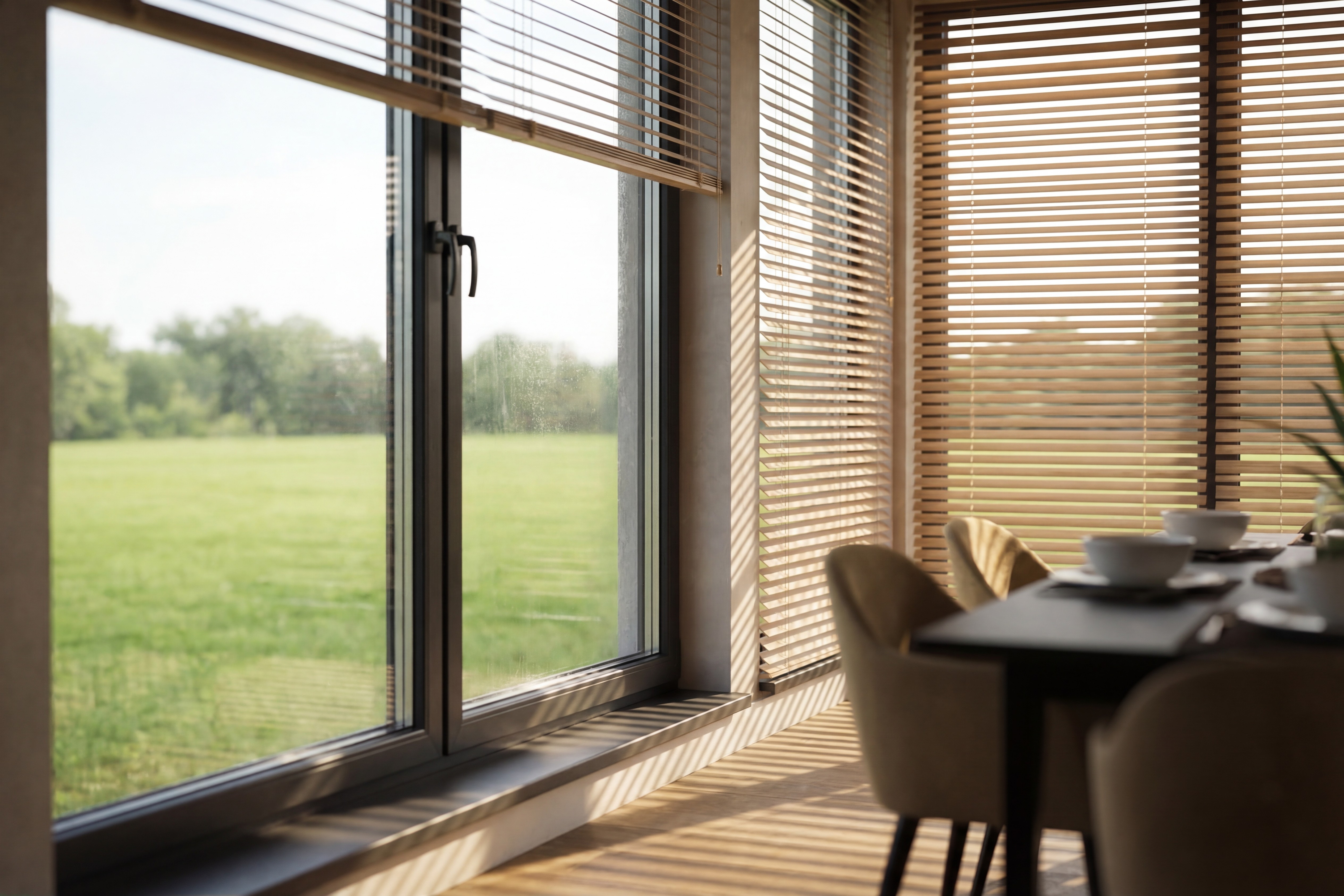 Duże przeszklenia z widokiem na otoczenie zostały uzupełnione minimalistycznymi roletami oraz ciężkimi zasłonami, umożliwiającymi płynną regulację światła.