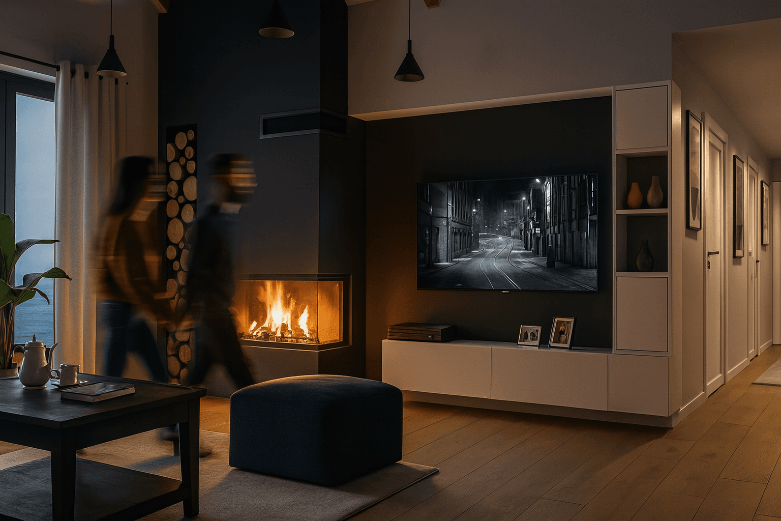 nowoczesny kominek jako centralny punkt przestrzeni.