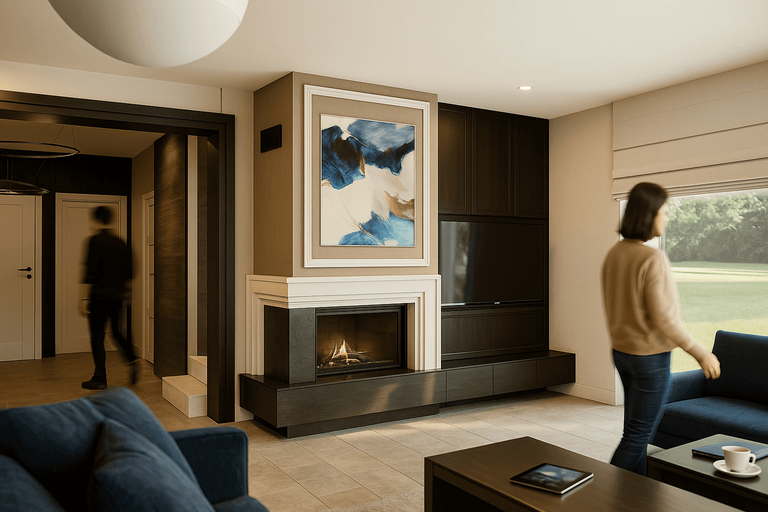 Całość dopełniają starannie dobrane akcenty, takie jak nowoczesny kominek oraz